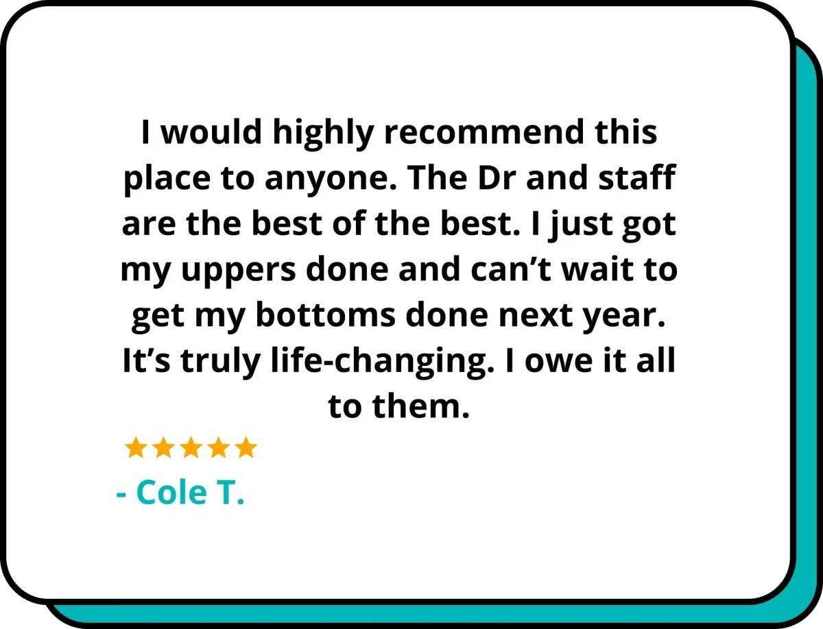 This place is amazing! I would highly recommend this place to anyone. The Dr and staff are the best of the best. I just got my uppers done and can’t wait to get my bottoms done next year. It’s truly life changing and I owe it all to them. This is the place you want to go.